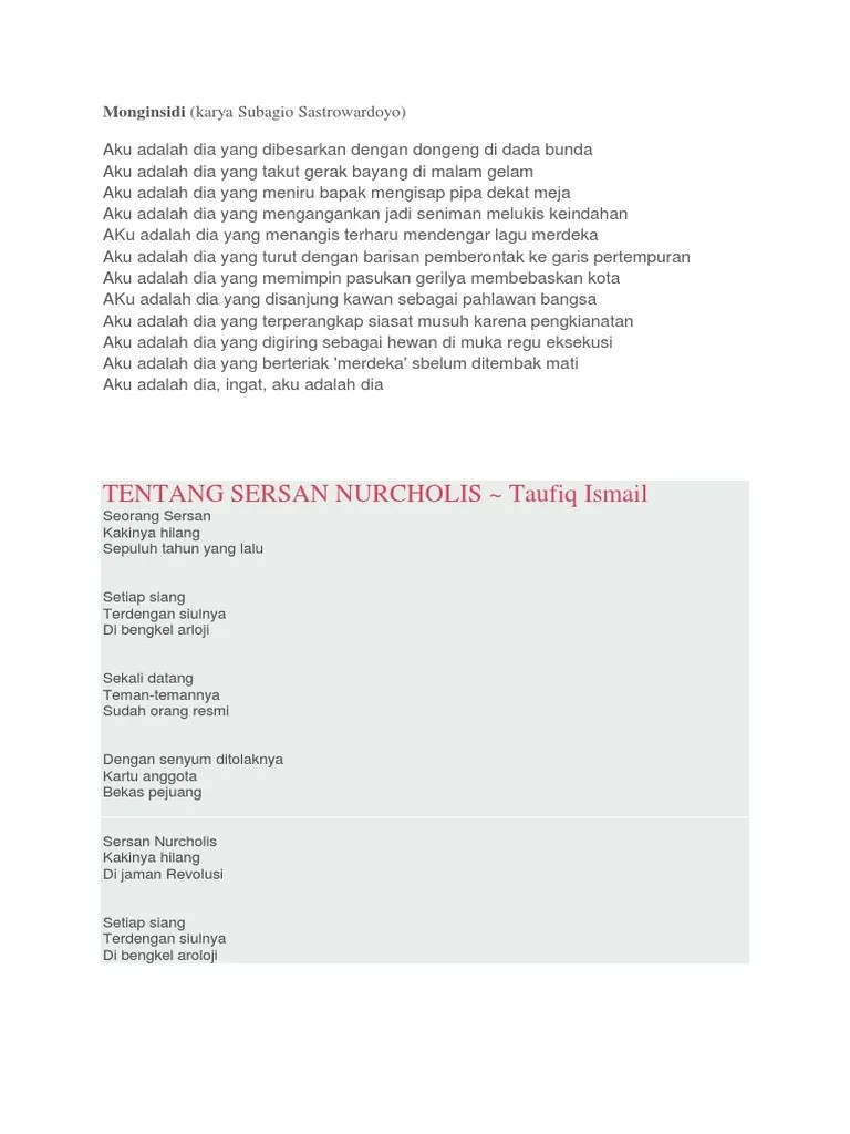 Check out rindu (musikalisasi puisi subagio sastrowardoyo) by banda neira on amazon music. Subagio sastrowardoyo adalah seorang dosen, penyair, penulis cerita pendek dan. Sosok pribadi dalam sajak subagio sastrowardoyo merupakan kumpulan esai sastra puisi yang penting grade original jual sosok pribadi dalam sajak subagio . Tangan akan hampa meraih ke . Dalam sastra indonesia subagio sastrowardoyo lebih dikenal sebagai penyair meskipun tulisannya tidak terbatas pada puisi. Pembacaan puisi genesis karya subagio sastrowardoyo. Ilmu sastra, fakultas ilmu budaya universitas gadjah mada , . Di dalam dada (karya subagio sastrowardoyo). Bagaimana kata seakan terbit dari tiada. Beberapa pilihan puisi subagio sastrowardoyo dalam simfoni dua. Kalau alam tak terangkum dalam dada. Karya subagio yang berbentuk kumpulan puisi, yaitu simphoni (1957), daerah perbatasan (1970), keroncong motinggo (1975), buku harian (1979) yang . Data penelitian ini berupa dokumen teks puisi karya subagio sastrowardoyo dengan judul aku tak bisa menulis puisi lagi.