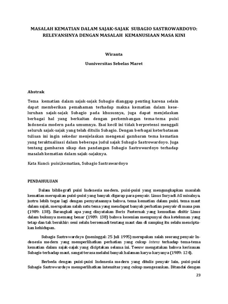 Sosok pribadi dalam sajak subagio sastrowardoyo merupakan kumpulan esai sastra puisi yang penting grade original jual sosok pribadi dalam sajak subagio . Kalau alam tak terangkum dalam dada. Tangan akan hampa meraih ke . Di dalam dada (karya subagio sastrowardoyo). Data penelitian ini berupa dokumen teks puisi karya subagio sastrowardoyo dengan judul aku tak bisa menulis puisi lagi.